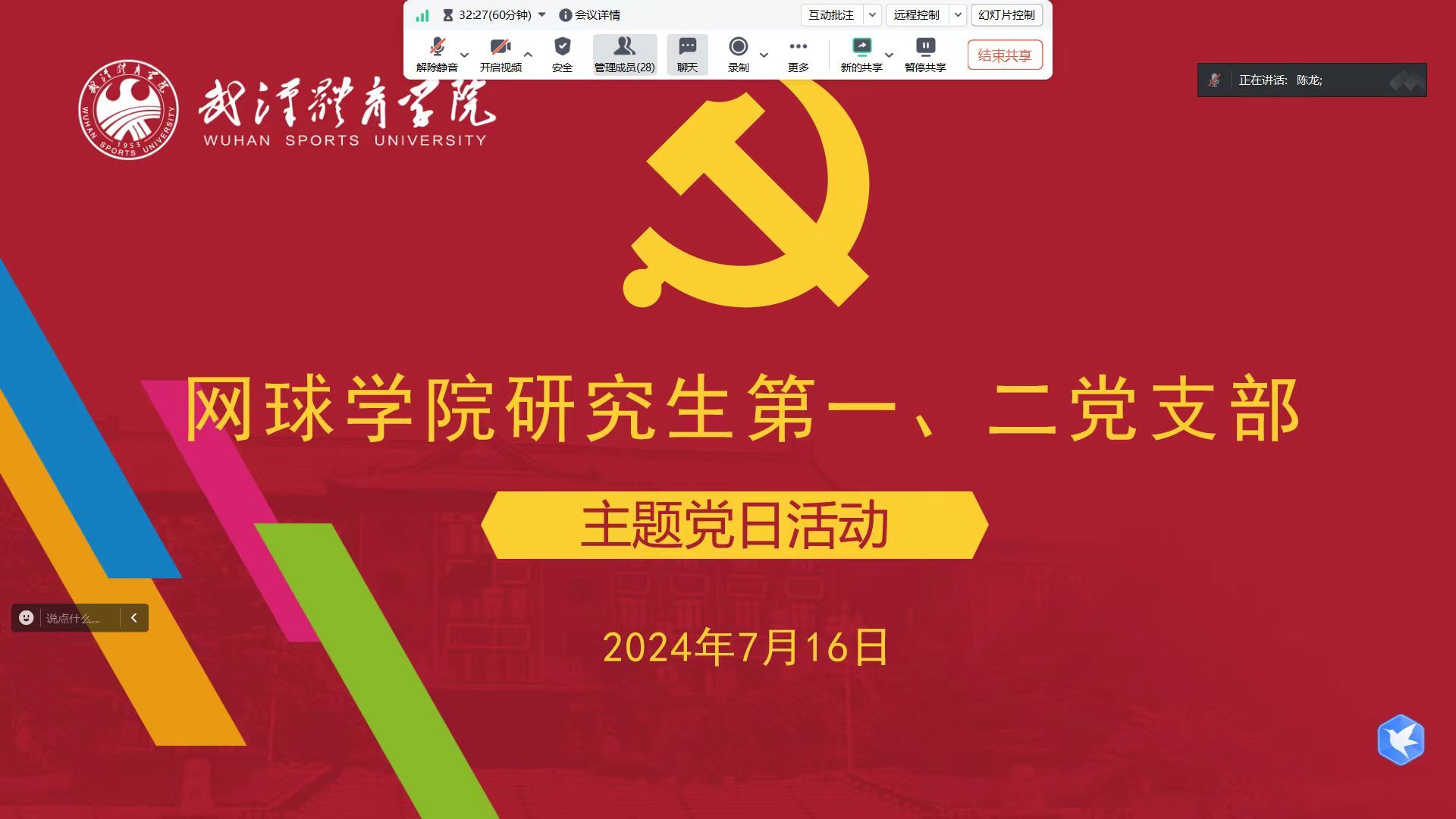 7月16日上午,网球学院研究生第一、二党支部于腾讯会议召开以“深刻领悟伟大建党精神,践行初心担当使命,推动党纪学习教育走深走实”为主题的7月份主题党日活动。研究生第一党支部书记李亮主持会议,研究生第二党支部书记刘长帅以及全体党员参加学习,并围绕学习内容进行交流分享。