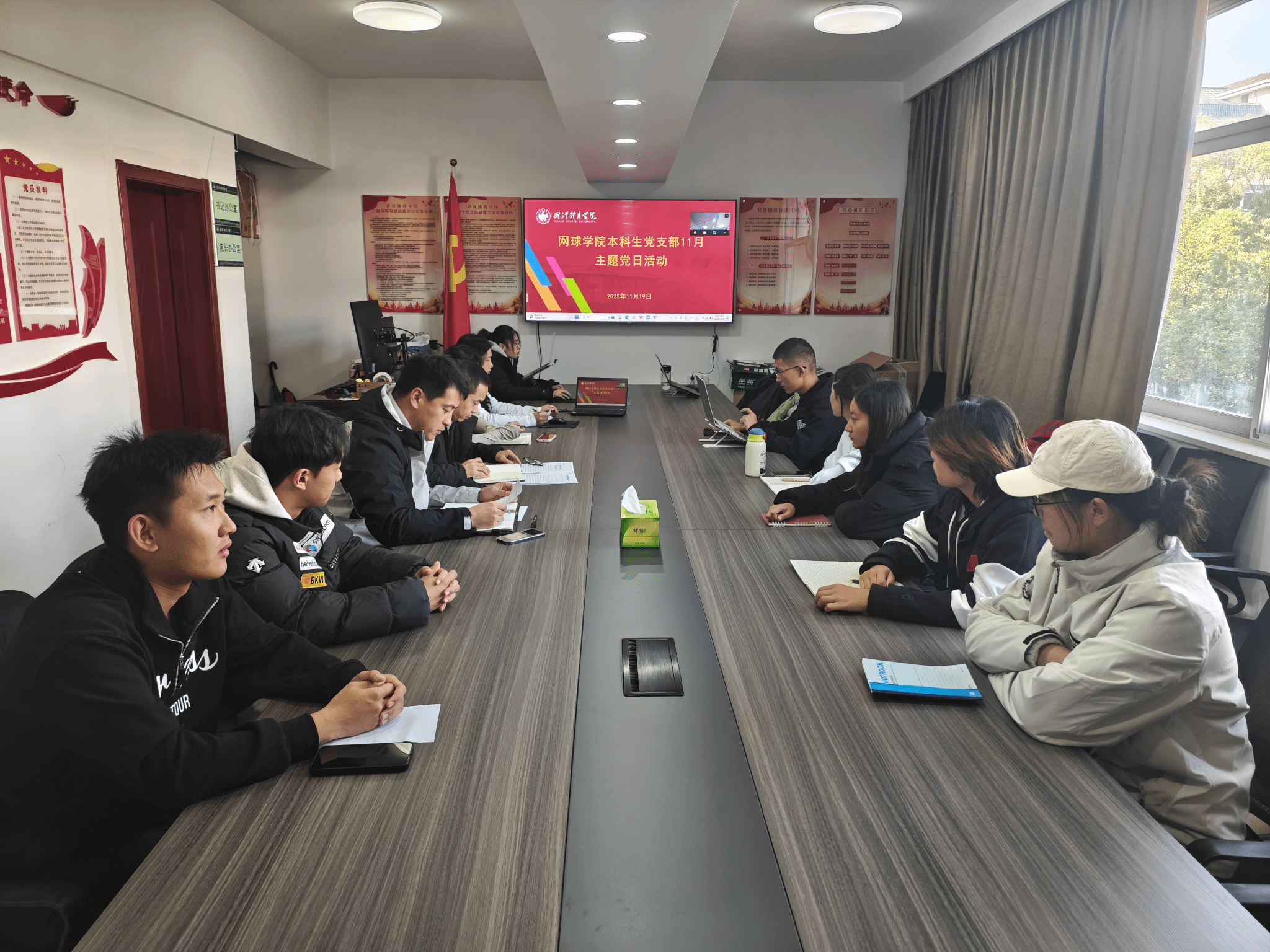 11月19日上午,网球学院本科生党支部在学院办公室召开以“深入学习贯彻党的二十届四中全会精神”为主题的11月份主题党日活动。会议由党支部书记刘长帅主持,全体本科生党员参加,网球学院党委副书记沈贞伟以普通党员身份参加学习。