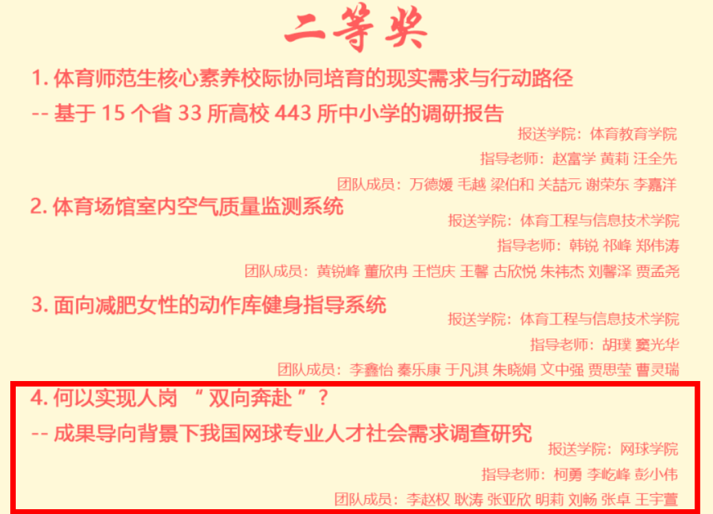 长期以来,学院紧密围绕“双一流”建设与人才培养目标,秉承“专业立院、科研强院、人才兴院”的行动方针,将挑战杯竞赛作为学科建设工作重点,充分发挥科技创新育人功能。下一步,学院将在学校党委领导下,进一步强化学科引领,凝聚建设合力,积极搭建学术科技竞赛平台,着力做好学术科技项目培育与科技创新人才培养,将服务青年发展与服务学科建设有效对接,力争在“挑战杯”“互联网+”等高水平学科竞赛中再创佳绩!为学校努力建成中国前列、世界一流应用研究型体育大学贡献青春力量!