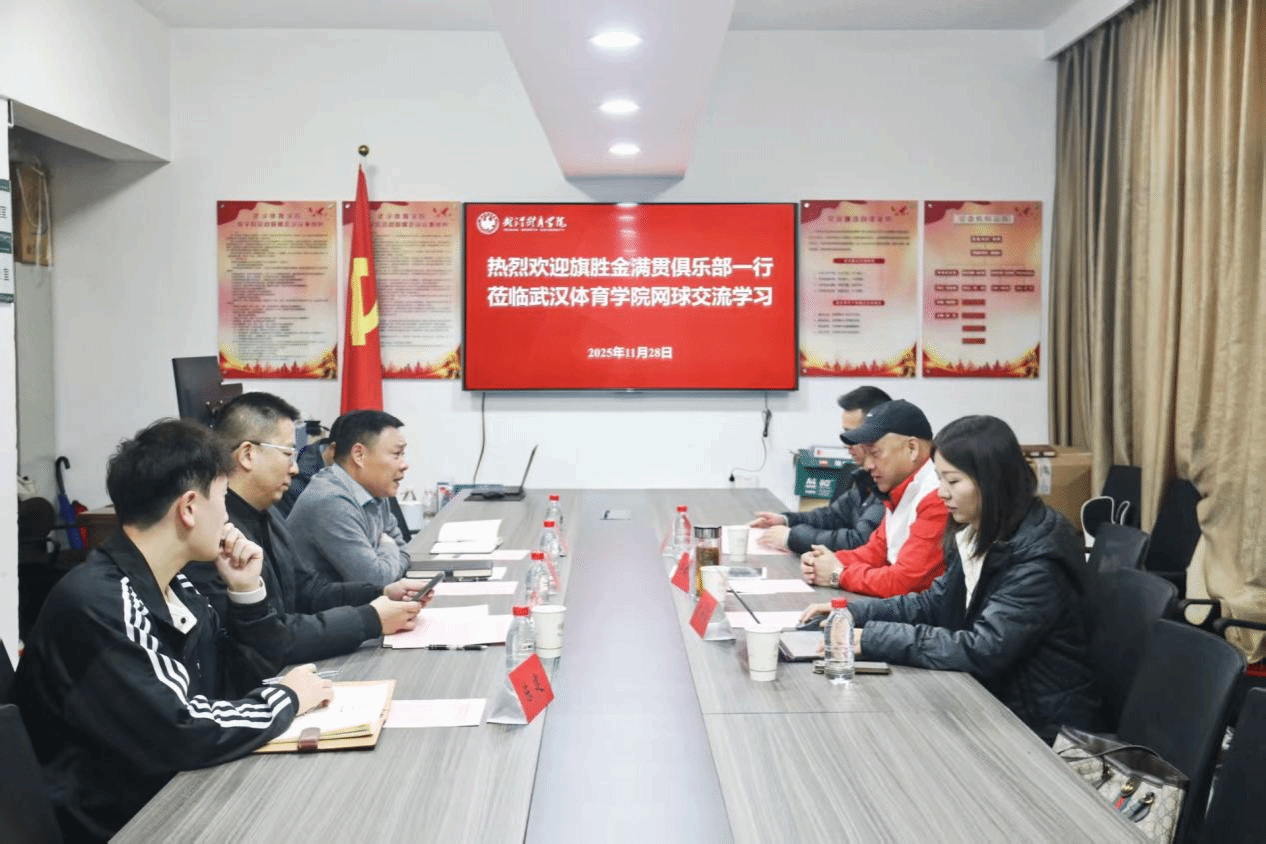 2025年11月28日上午,旗胜金满贯俱乐部(武汉)有限公司董事长郑建坪一行莅临武汉体育学院网球学院交流学习。武汉体育学院网球学院党委书记、院长柯勇,网球学院党委副书记、副院长沈贞伟,竞技体育学院副院长、体能训练专家李丹阳,运动康复专家陈建参加。