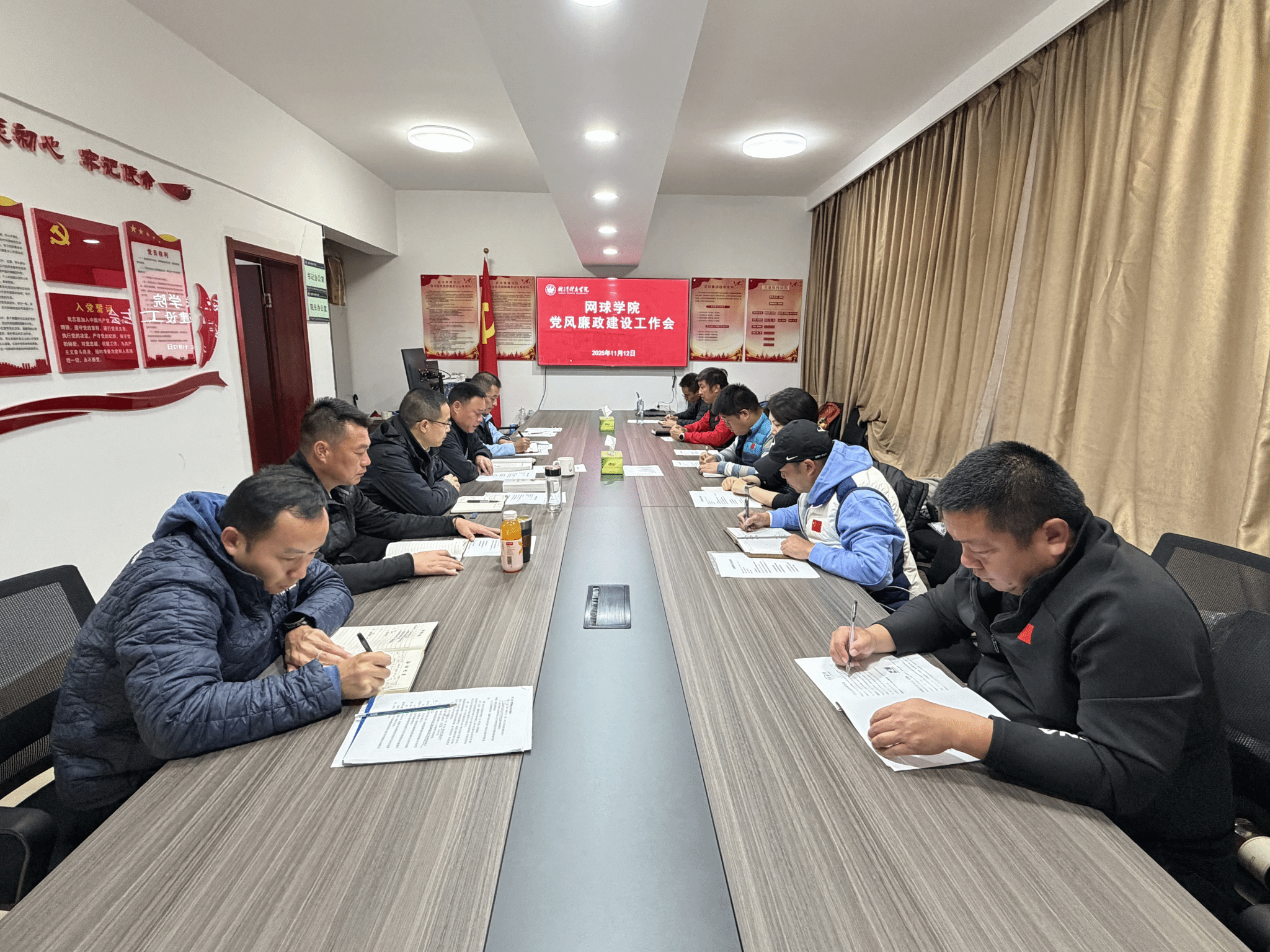为深入贯彻落实全面从严治党要求,持续巩固风清气正的政治生态和育人环境,11月12日,网球学院在学院会议室召开党风廉政建设专题会议。会议由党委书记、院长柯勇主持,党委副书记、副院长沈贞伟及全体教职工参加。